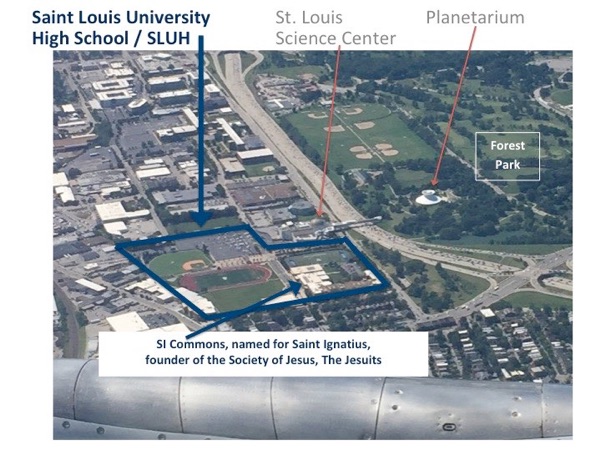 Our landing in St. Louis was from the east, which requires “a u-turn” over mid-city... the pilot thankfully “tipped the wing” for a brief second, letting me me capture this photo of SLUH / St. Louis University High School, where Matt attends, and the St. Louis Science Center, and Forest Park. Nice!