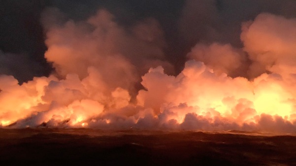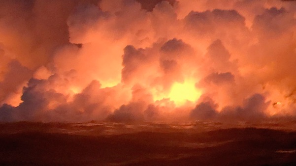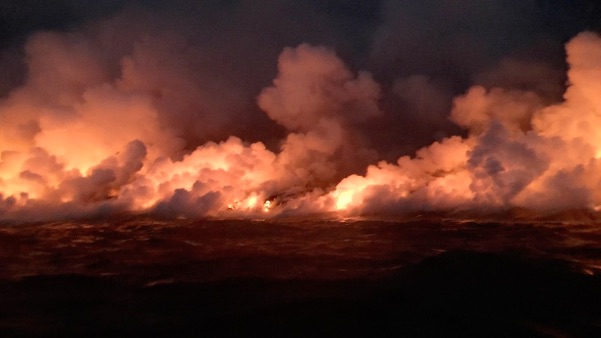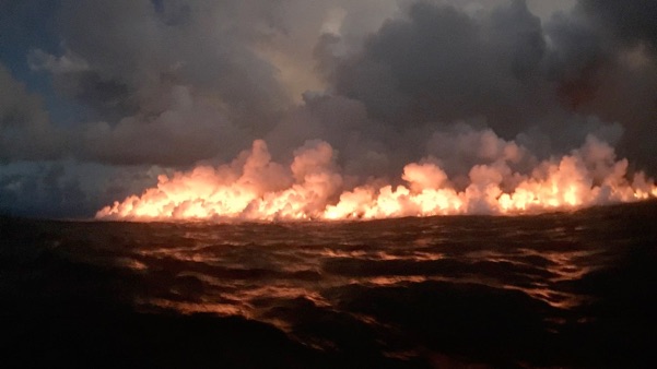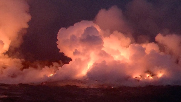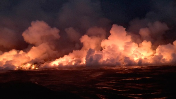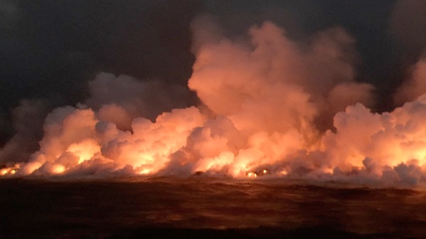 Lava flowing into the ocean across an area two miles wide