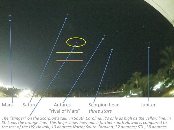 The skies in Hawaii were more cloudy than we expected on the trip, which was ok, but it did mean that we didn’t see the stars too often. But this night I was able to see three of four of the bright planets currently visible in the night sky (Venus had already set, to the west / right), and captured this view from our balcony.