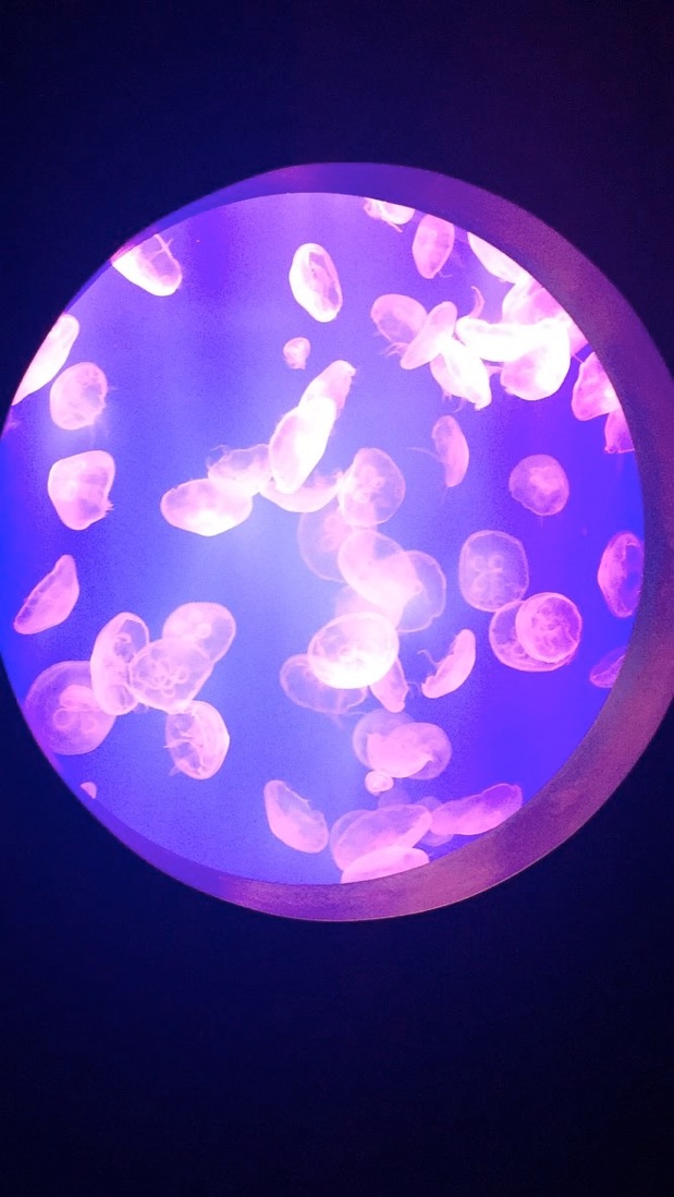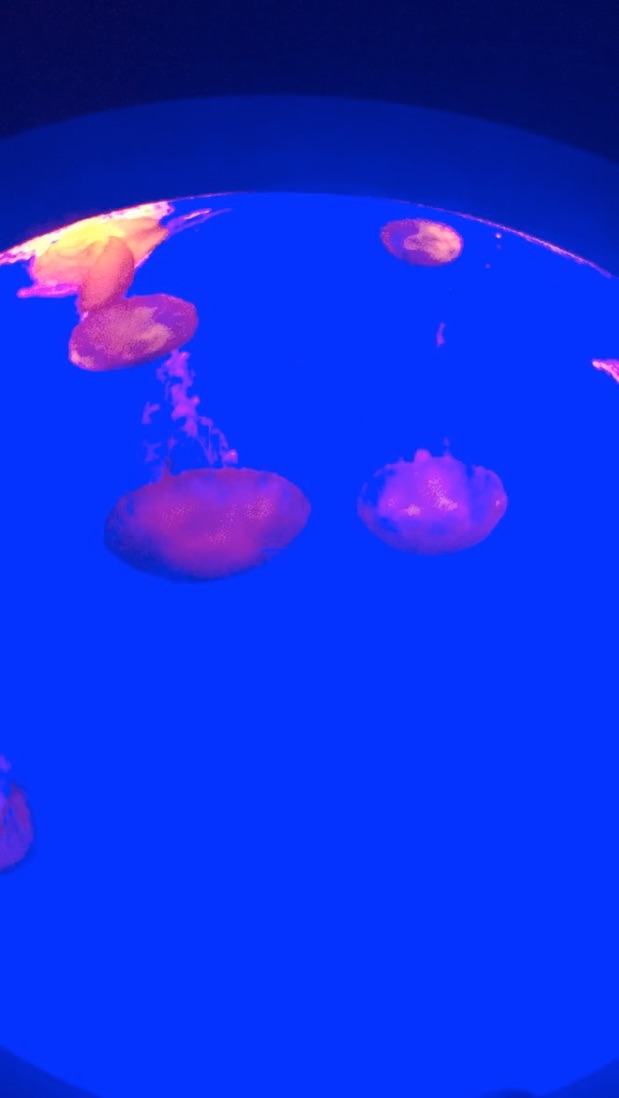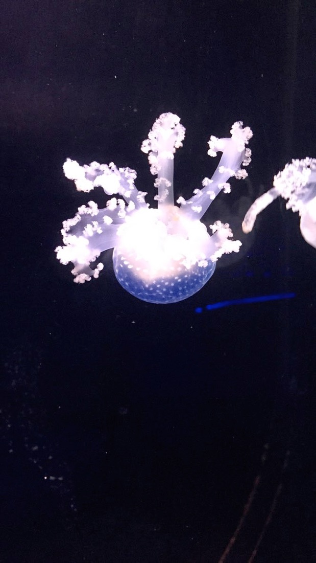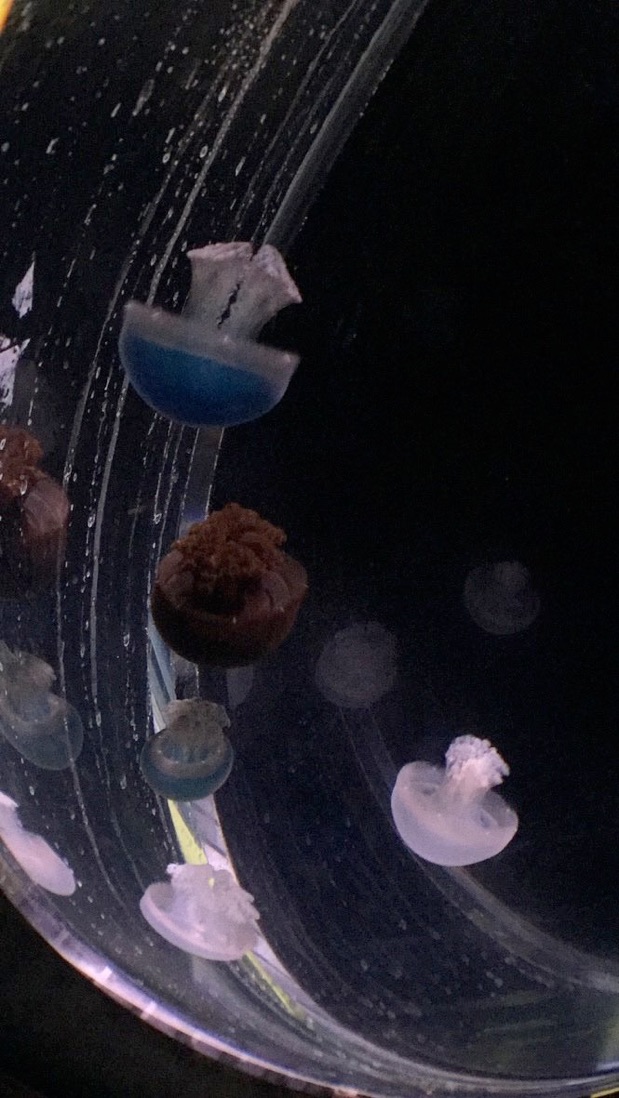 ⁃Jellyfish - bright organs on blue water, white and clear, and ones that look like little mushrooms zooming through the water