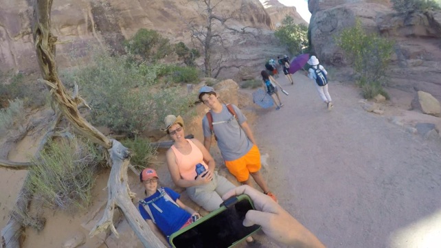 The hike back to Landscape Arch... you can see it ~ .8-1.0 miles in, and we walked in about another half mile for the family photo.