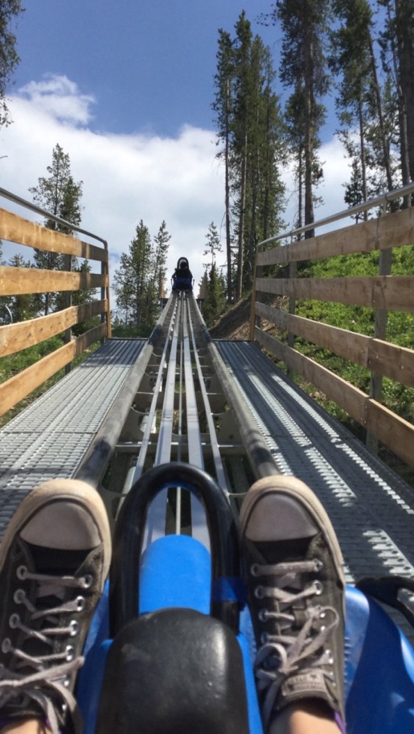 5)the kids riding the Forest Flyer toboggan / roller coaster at the top of the gondola.