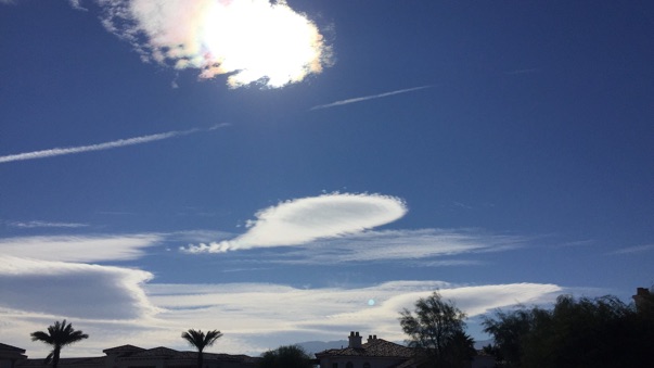 ... and these lenticular / mountain clouds, “which form high above a mountain when a stream of high-level moist air rises as it flows over a summit. If there are several layers of moist air, piles of lenticular clouds are formed looking uncannily like ‘flying saucers.’”